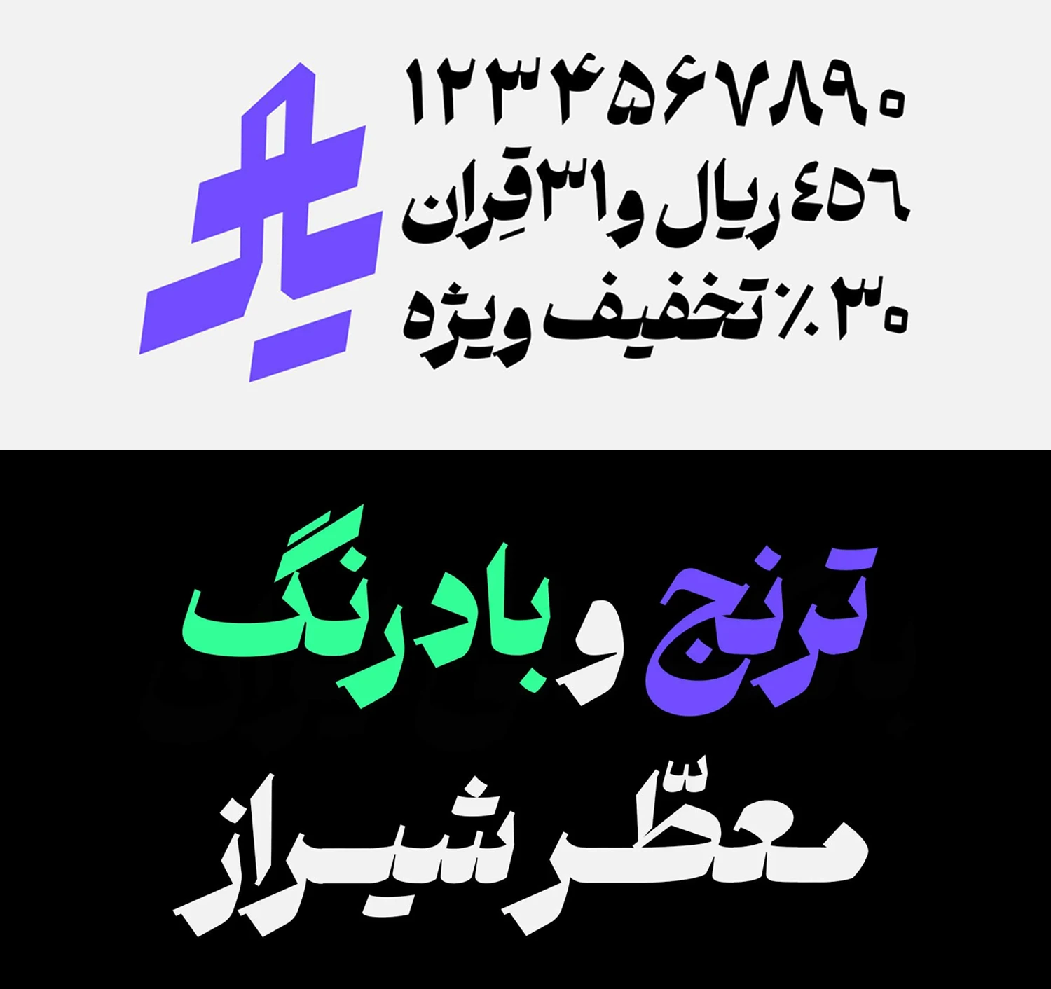 برای مثال، در حروفی مانند «ب، ن، م، خ، ح» زوائدی در انتهای حروف قرار داده شده که علاوه بر برجسته کردن فونت، ظاهر ان را مدرن، نمایشی و امروزی میکند. در پروژههایی با هویت فرهنگی ایرانی مانند پوسترها، جلد کتابها یا هویت بصری برندها چنین ساختاری حس خاصی را به مخاطب القا میکند.